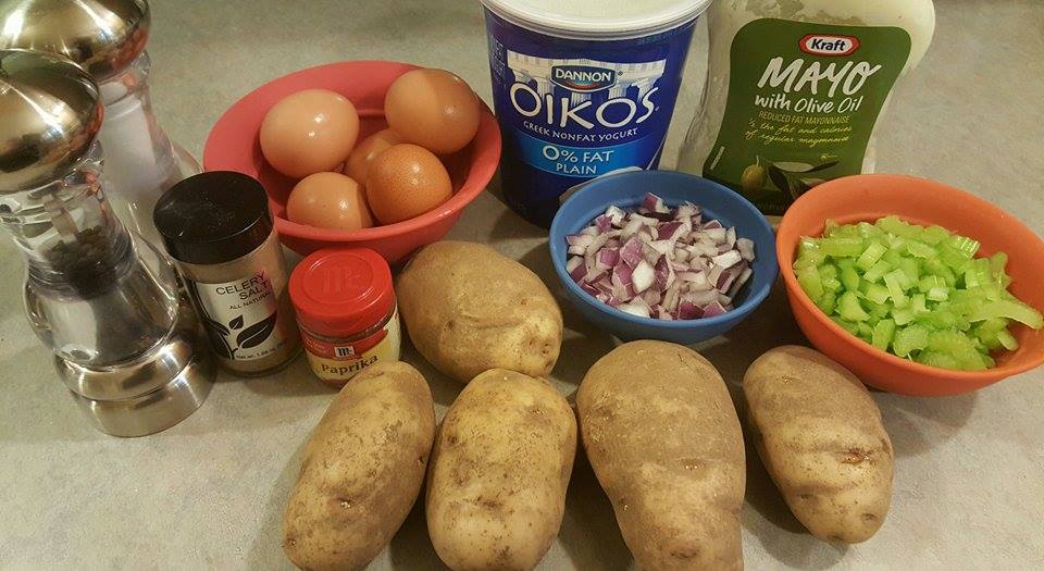 5. Drain the potatoes and set them in a mixing bowl. Break up the potatoes a bit before adding the celery, onions, and 4 of the eggs. Also stir in the Greek yogurt/mayo mixture, making sure it’s evenly dispersed before slowly mixing in the dry ingredients.