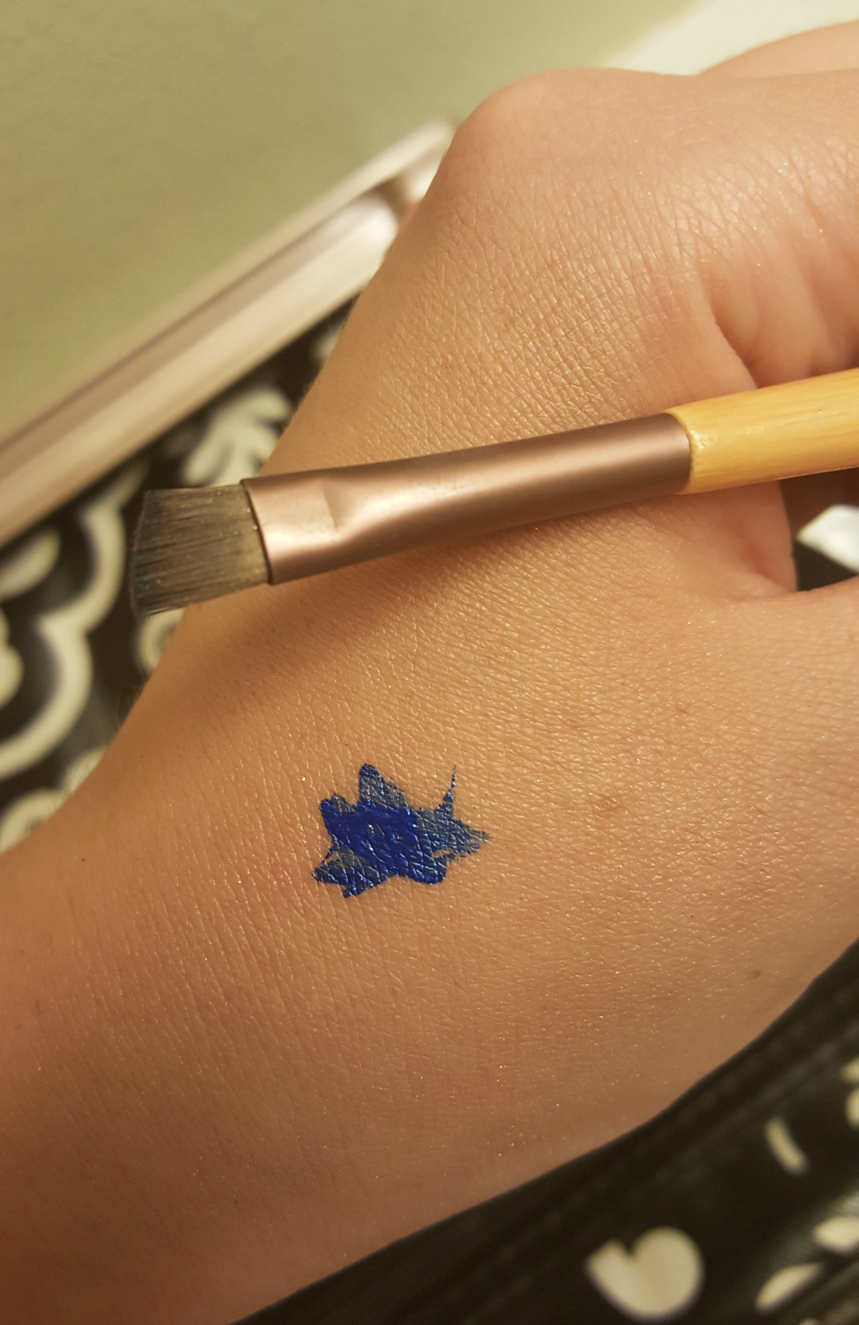 *6. For this part I used the Electric Blue NYX Liquid Liner above the black and HERE’S where I ran into trouble the first go-round. The applicator was hard for me to use to get my liner the way I wanted. It was hard to draw a good line with it. I still love the color so this time I put the liner on the back of my hand and used a small angled brush to dip into the liner and apply it that way. It gave me a better and more precise line. I traced the black line and slightly winged it out at the end.